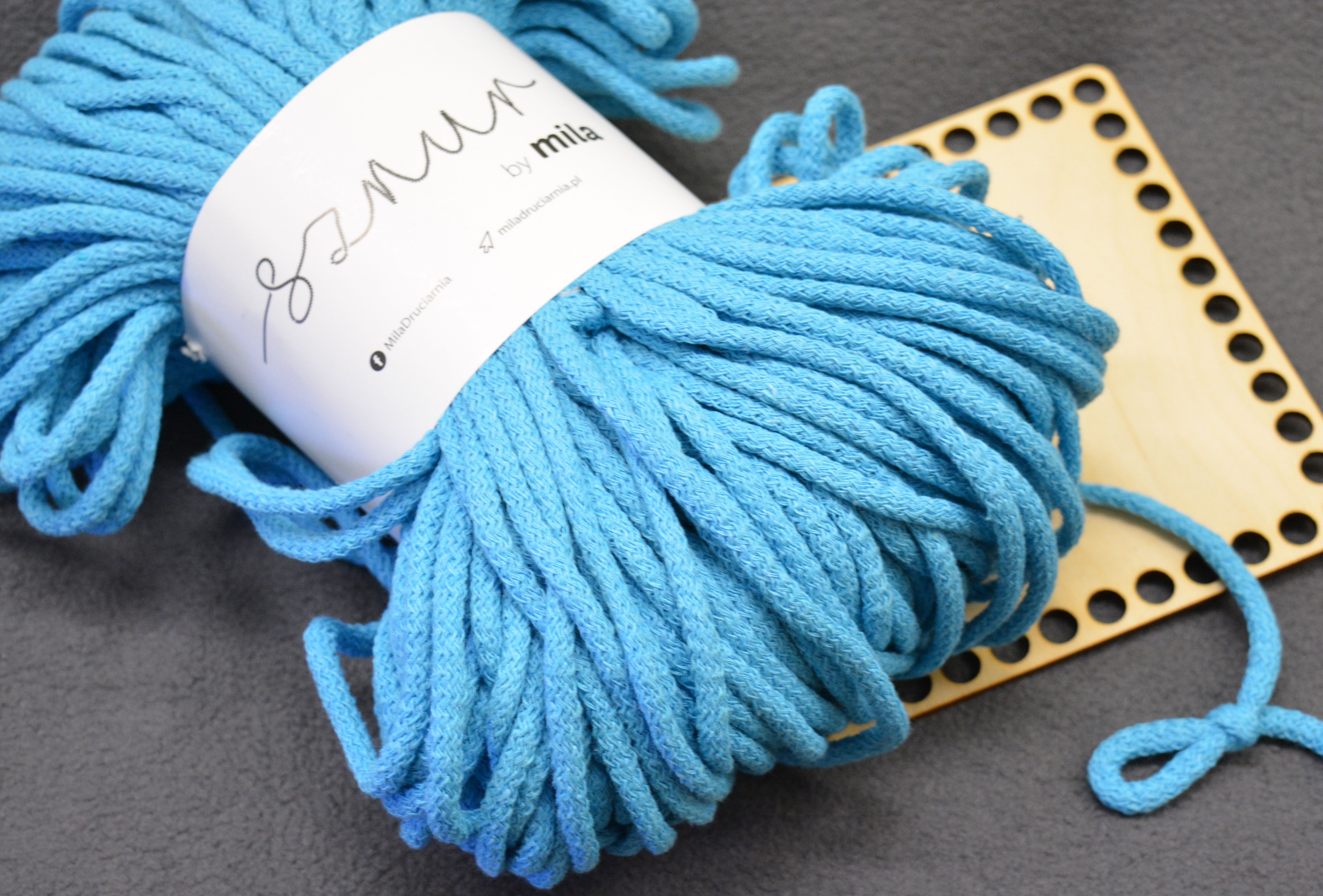 Bavlněná šňůra 5 mm s polyesterovým jádrem. Šnůra je ideální pro háčkování košíků, tašek, rohoží, podložek, pufů atd., ale také pro techniku macramé - drhání. Šňůra je na dotek měkká a pružná.