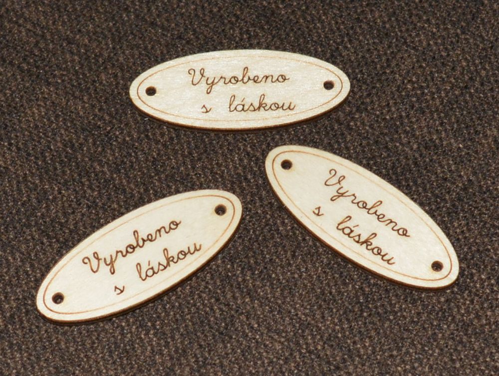 Dřevěnou cedulku ve tvaru oválu zdobí nápis Vyrobeno s láskou. Pro přišití jsou připraveny dírky. Nedoporučujeme prát.