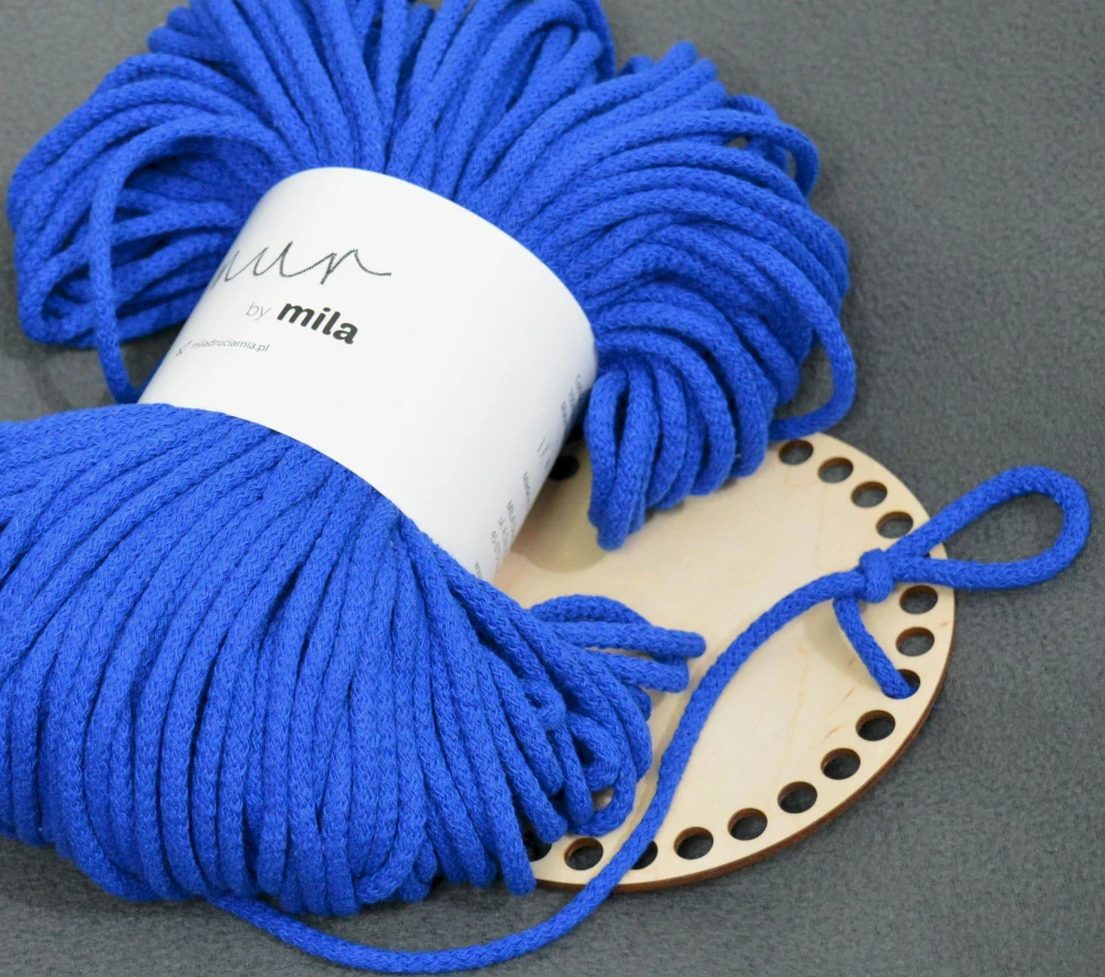 Bavlněná šňůra 5 mm s polyesterovým jádrem. Šnůra je ideální pro háčkování košíků, tašek, rohoží, podložek, pufů atd., ale také pro techniku macramé - drhání. Šňůra je na dotek měkká a pružná.