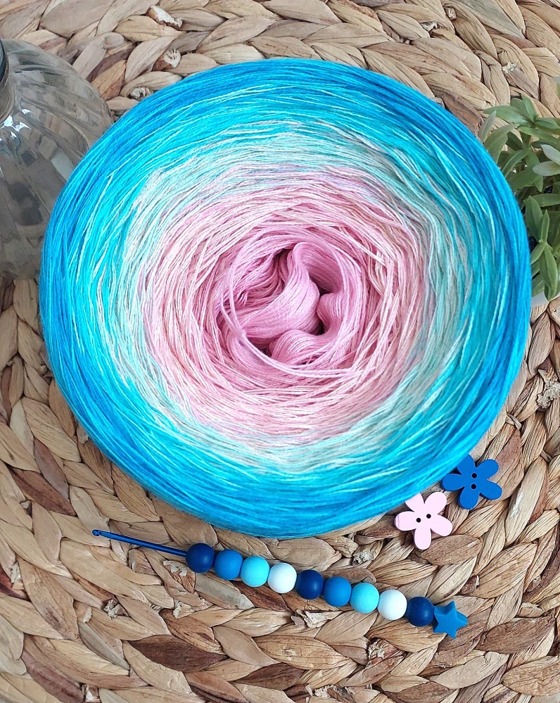 Příze Cukrová vata je jako sladká vzpomínka na bezstarostné dětství, jarmarky a duhovou oblohu. Začíná něžnými odstíny růžové a plynule přechází do chladivých modrých tónů, které končí středně modrou – jako byste se dívali na oblohu skrz růžové brýle. Tato hravá a zároveň jemná kombinace přináší do vašich projektů radost, svěžest a špetku fantazie.