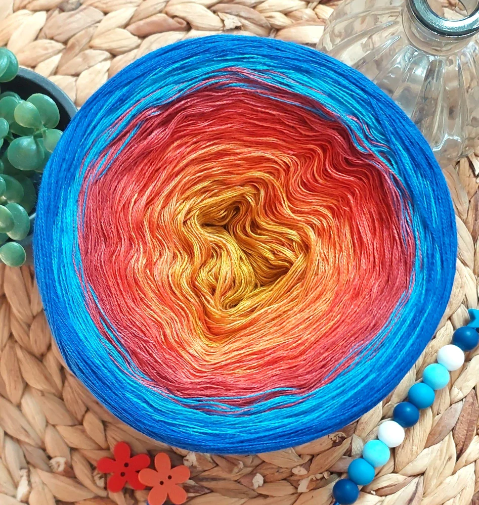 Příze Ohnivá řeka je jako žhavý proud roztavené energie, který se na své cestě setkává s klidnou vodní hladinou. Klubíčko začíná temně žlutými tóny, plynule přechází přes sytě oranžovou do cihlově červené, a poté se přelévá do dvou odstínů modré – jako když se žár postupně chladí dotykem vody.